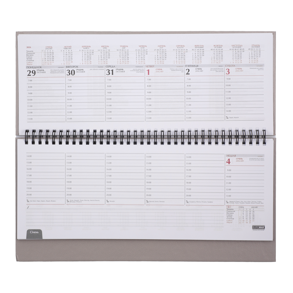 Дві сторінки (розворот) містять вертикально розміщені 7 днів тижня (субота та неділя в одному стовпці) з організатором часу з 7:00 до 20:00, календар на рік та поточний місяць, знаки зодіаку, іменинники, свята та пам'ятні дати на кожен день, а також вільне поле для нотаток;